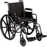 Steel frame, dual axle positioning. Padded vinyl upholstery and padded armrests. Tool-free adjustable front riggings with composite footplates. 8"x1" solid rubber front casters are adjustable in 3 positions. Easy push-to-lock wheel locks. 16" x 16" Removable desk-length arms, Swing-away footrests