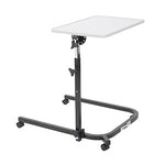 The Drive Medical Deluxe pivot and tilt overbed tray table for hospital bed is designed to meet the needs of many different users. The adjustable pivot and tilt arm allows this overbed table to be height, angle and tilt adjusted providing a versatile tray table with the ability to be used in many different applications. The table top is easy to clean, features a stylish grey finish and raised outer lining to prevent items from sliding off. The frames U base and pivot arm allows wheelchair users to position the table top within comfortable reach compared to traditional overbed tables. The mast of the table pivots, and it can lock flat on the floor or at 90 degrees ensuring a flat table surface no matter the mast's positions. Four 2" casters with two locking safely into place for security and stability. This overbed tray table folds flat for easy storage in tight spaces when not in use.