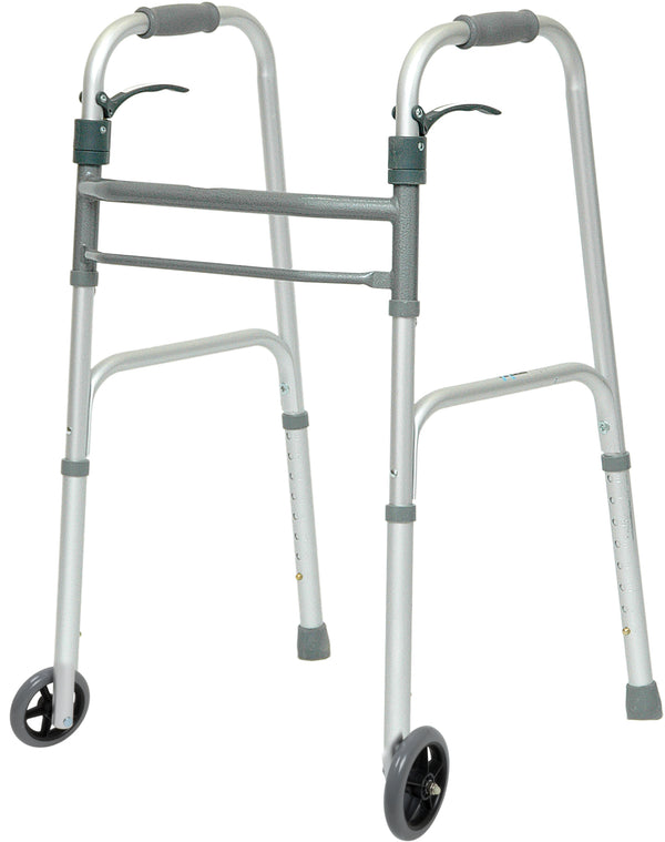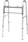 FEATURES • Attractive, lightweight aluminum frame • Adjustable height settings • Easy-to-use push button folding mechanism provides audible click when locked • Front cross brace near top of walker allows for full stride • Each side operates independently to allow easy movement through narrow spaces and greater stability while standing • Vinyl contoured hand grip for added comfort and long lasting wear • Rear glide cap allows for walker to slide easily and smoothly over most surfaces (come standard on models with 5" wheels) • Folds flat for transport and storage