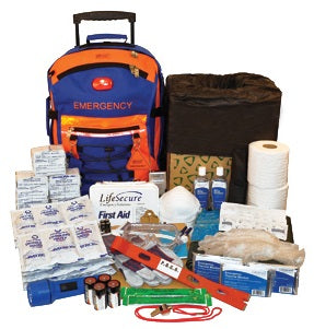 A portable rolling emergency support kit for evacuating students and staff or supporting them in place during a lockdown or for the first several hours after an emergency or disaster. Each kit includes survival supplies for up to 29 students and one teacher. High-visibility marking and flashing safety signal provide quick emergency identification and increased safety in use. These kits also provide portable emergency support for fieldtrips and other off-campus events.