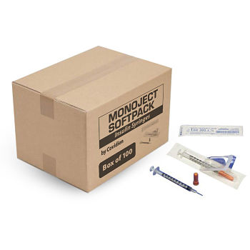 Monoject Insulin Syringes with Needles are SoftPacked for easy convenience and ease of use. A division of Covidien, SoftPack Insulin Syringes are designed for Diabetes patients. These Insulin Syringes come with an Accu-tip Plunger Tip, Accu-Scale graduations and a clear barrel construction with bold scale for easier reading and accurate measurements. Kendall Insulin Syringes and Needles are soft packed in a one step peel away package that facilitates quick and easy opening for aseptic handling. Attached Ultra-Comfort Needles are lubricated for increased patient comfort and less pain. Syringe tip caps included on each syringe provide complete protection from contamination of sterile fluid pathway.