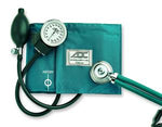 Cuff and stethoscope kit has a color-coordinated professional sphygmomanometer and Sprague-Rappaport-type stethoscope. Adcuff™ calibrated nylon cuff with Size Guide™ and gauge holder pocket features a black enamel 300 mmHg, no-pin stop manometer and nickel-plated air release valve. Latex inflation bladder and bulb. Stethoscope can be used with adults, children and infants. Threaded chest piece has two transposable diaphragms and three bells for detection of high-, middle- and low-frequency sounds and double tubing for acoustic separation.
