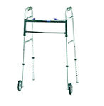 The Dual Blue-Release™ Adult Invacare Walker with Wheels provides visual and audible "locked" cues. The walker has a lower side brace for added stability and is lightweight and easy to lift and maneuver. Walkers include PVC handgrips for comfort and long-lasting wear and anti-rattle silencers for quiet operation.
