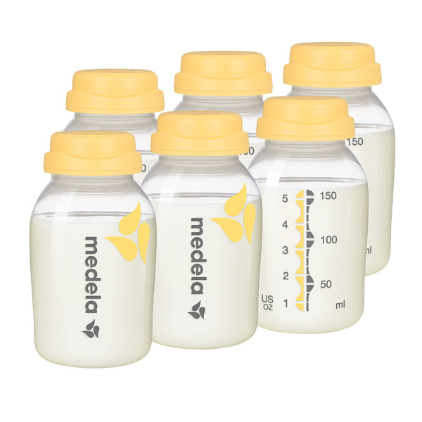 • Clear plastic bottles designed to easily collect and store breastmilk.