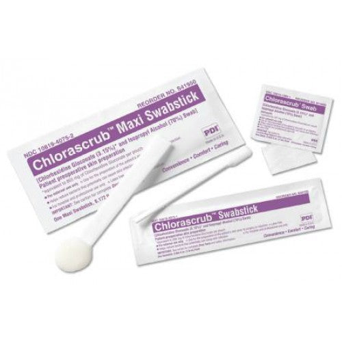 PDI Prevantics Chlorascrub Disposable Swabsticks 1-3/5mL, 3-1/8" x 1-1/8" Size, Pre-Moistened, For Pre-Operative and Pre-Injection Preparation. The PDI Prevantics swabsticks are long lasting and effective swabs. With one quick and easy step these swabs cleanse the skin and provide up to a 24-hour guard against pathogens, such as most types of bacteria, fungi, yeast, and viruses.