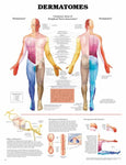 Dermatomes chart provides an easy to understand map of the approximate areas of skin supplied by nerves from a single spinal root. The central figure beautifully and colorfully illustates the cutaneaous areas of peripheral nerve innervation, labeled with the corresponding dermatome.