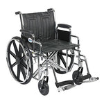 The Drive Medical Heavy Duty Wheelchair with Detachable Desk Arms and Swing Away Footrest comes with a Dual Cross Bar that reinforces the carbon steel frame, which has an attractive, chip proof, maintainable, triple coated, chrome finish and double embossed, vinyl upholstery. The standard dual axle provides an easy transition of seat to hemi-level.
