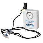 The Drive Medical Pin Style Pull Cord Alarm easily secures to a bed or chair with a self-contained clip. It features a pin-style activation cord that pulls when the user moves, dislodging the pin from the alarm unit and activating the signal. The alarm includes two volume settings and can be deactivated with the On/Off switch. The product requires one included 9V battery.