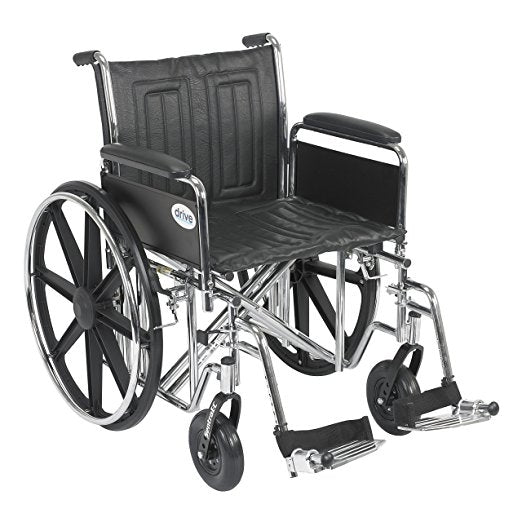 The Drive Medical Sentra EC Heavy Duty Wheelchair, Detachable Full Arms, Swing away Footrests comes with a Dual Cross Bar that reinforces the carbon steel frame, which has an attractive, chip proof, maintainable, triple coated, chrome finish and double embossed, vinyl upholstery. The standard dual axle provides an easy transition of seat to hemi-level.
