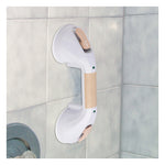 The 12" suction cup grab bar by Drive Medical can be installed and removed without the hassle of tools or professional installation, meaning you can use it right out of the package. The large suction cups provide an extremely strong hold. Release levels make attaching and detaching the bar a cinch. A color indicator shows you whether installation was "safe secure" or if you must "re-affix" the grab bar. The product is guaranteed to not damage your property. The suction cup is 4" in diameter and must make full contact with a smooth surface without breaking grout.