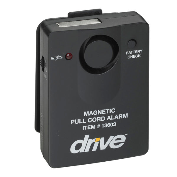 Once the magnetic pull-switch is removed, the alarm sounds on this tamper-proof pull-cord alarm by Drive Medical. The pull-switch, which includes a convenient On/Off switch, activates from any direction and adapts to various situations with a cord that adjusts from 28" to 58". The unit mounts easily on a bed or wheelchair - even on a patient's clothes thanks to an alligator clip. Volume adjusts from 97 to 103 dB on the alarm, which requires one 9V battery (included).