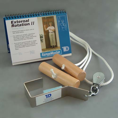 RangeMaster Shoulder Pulley with Metal Bracket And Flip Chart Exercise Guide is a high-quality, low-cost shoulder pulley restores range of motion. Custom-made, self-lubricating, nylon-rubber pulley won't squeak. Available with choices of wooden or molded rubber handles, and metal door bracket or webbing door strap. Includes flip-chart exercise guide with extensive exercise options 7ft long nylon rope