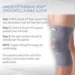 The Swede-O® Thermal Vent® Open Patella Knee Sleeve is designed to help relieve aches, pains, sprains, strains, weakened knees, and knee stiffness associated with arthritis. The open patella design reduces pressure which can sometimes cause or aggravate knee injuries by applying pressure to the patella during a workout. The comfortable support, gentle compression, and warmth help relieve knee pain and promote healing. This product's anatomical form contours to the natural shape of the knee for increased comfort. The material is soft and comfortable against the skin; bilateral design fits right or left knee.