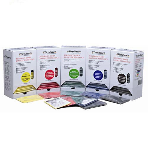 TheraBand Resistance Band Dispenser Box of 30 x 5ft individually packaged Bands.Proper use of these systems for resistive exercise provides both positive and negative force on the muscles, improving strength, range of motion and cooperation of muscle groups.Color-coded progressive resistance gives at-a-glance documentation of progress from one level to the next.