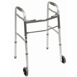 The Roscoe Medical Two-Button Folding Walker with wheels provides maximum strength and a lightweight design.